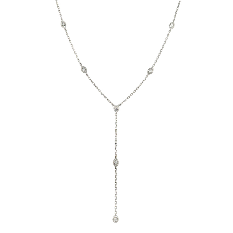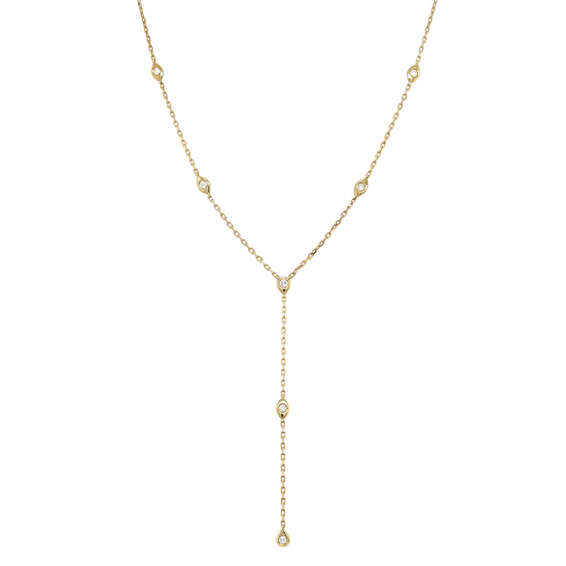 This lariat-style diamond necklace is designed to fall naturally along the neckline, creating a fluid line of light and movement. Set with delicate diamonds spaced along a fine gold chain, it elongates the silhouette with quiet elegance. The adjustable drop allows the necklace to be styled with ease, adapting effortlessly to the body and to the moment. Refined yet sensual, it is a piece that feels light on the skin and confident in its simplicity